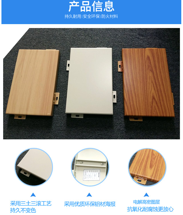木紋鋁單板是以高等級鋁合金為主要材料,按工程現場設計的尺寸、形狀和構造形式經過數控折彎等技術成型,并在其表面氟碳噴涂的基礎上采用意大利木紋膜,經抽真空處理,將木紋膜移印到鋁單板的氟碳涂層上的一種高檔金屬裝飾材料。我公司生產的木紋鋁單板采用國際先進新型圖紋裝飾材料,圖案高檔華麗、色澤紋理逼真、圖紋牢固耐磨,不含甲醛、無毒、無有害氣體釋放,使您不必再為裝飾后油漆和膠類物質帶來的異味及身體傷害而擔憂,品質卓越,是高檔建筑裝飾的首選材料。