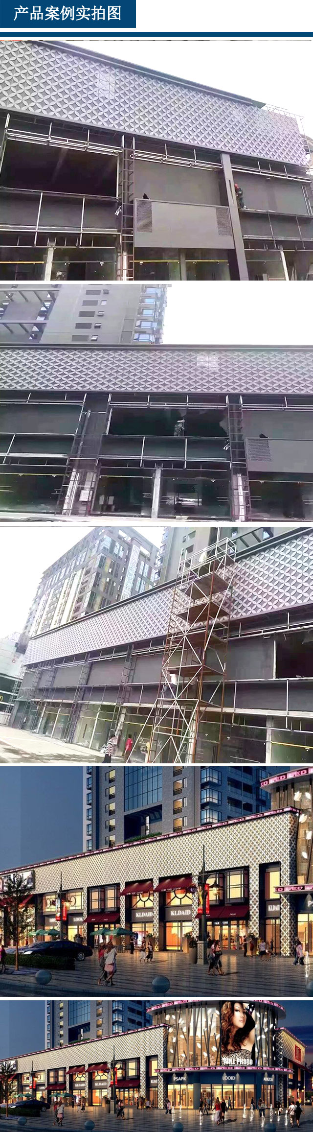 造型鋁單板是根據(jù)工程項(xiàng)目的設(shè)計(jì)需要,采用精密加工設(shè)備,通過開料、沖孔、整平、折邊、開槽、沖角、焊接、打磨和噴涂等復(fù)雜加工而成。造型鋁單板設(shè)計(jì)風(fēng)格獨(dú)特、結(jié)構(gòu)隨意、造型各異。