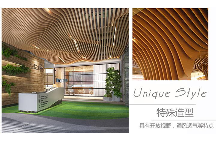 造型鋁方通由鋁板按要求開料再燒焊成弧形。美觀的外形,配予不同的顏色,能組合出不同裝飾風格,塑造出不同的視覺效果。